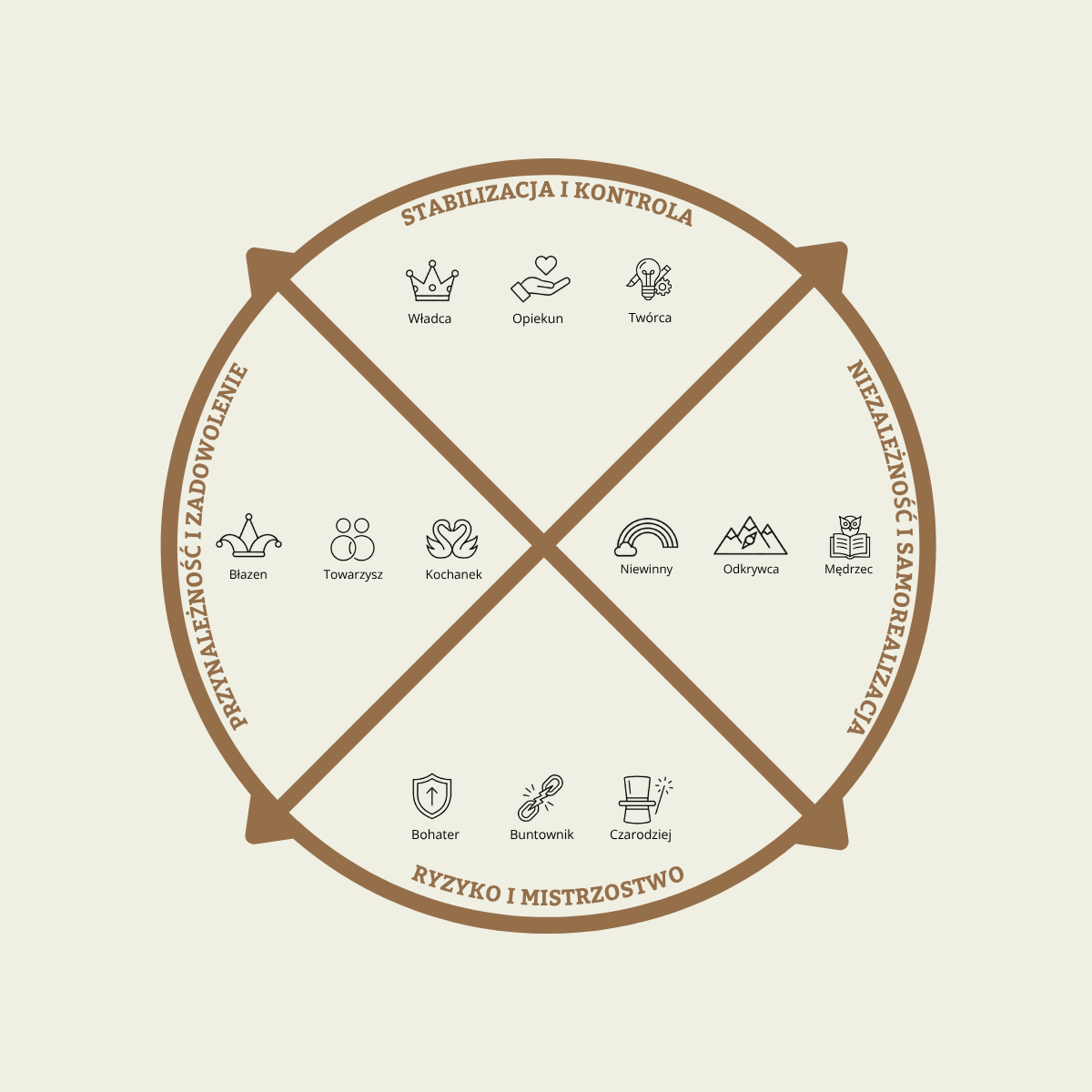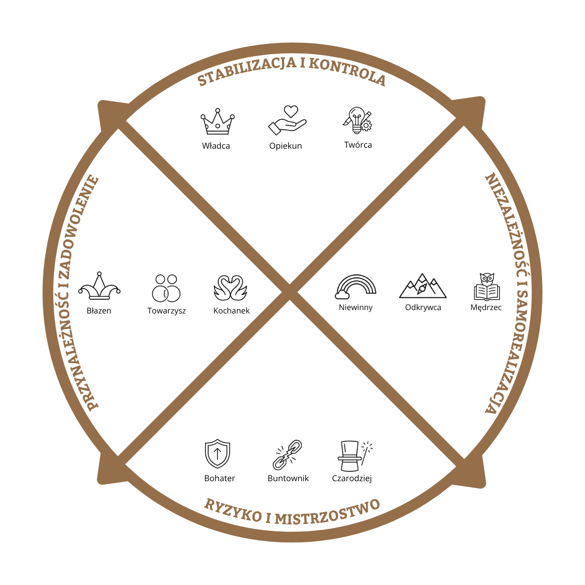 Mapa archetypów marki, spopularyzowana przez Margaret Mark i Carol S. Pearson w książce The Hero and the Outlaw, dzieli dwanaście archetypów na cztery główne kwadranty motywacyjne.